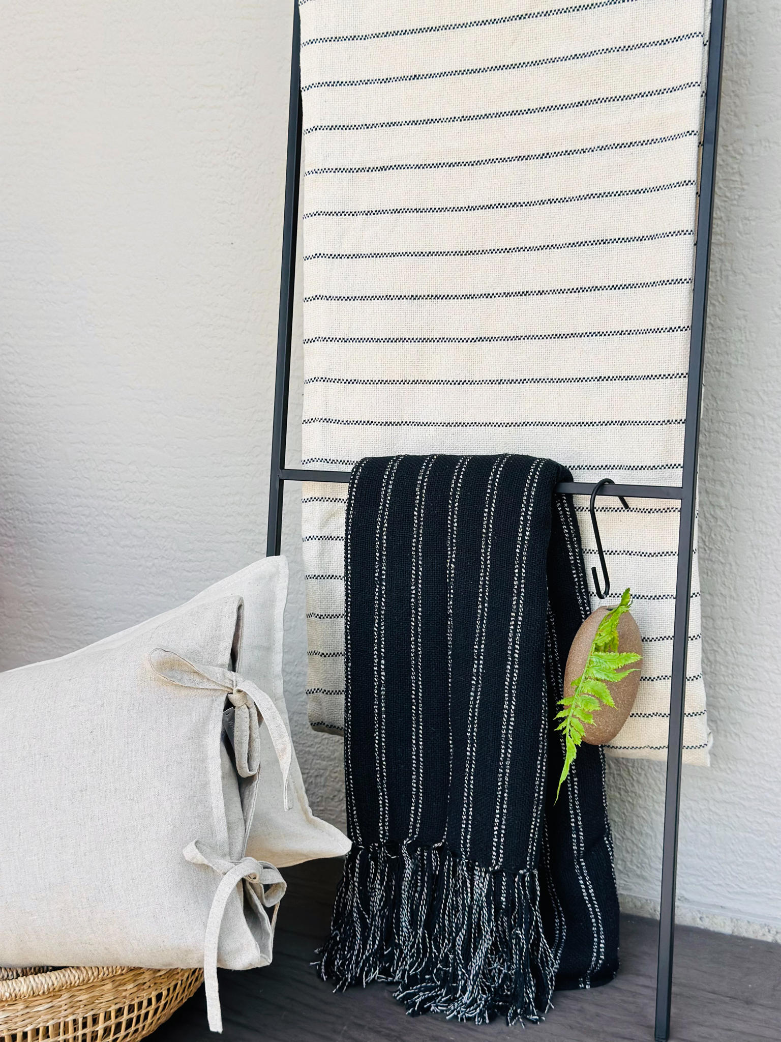 A Manta Dani é uma adição sofisticada e aconchegante à sua decoração. Confeccionada em algodão reciclado off white, com delicadas listras pretas, ela combina elegância com um toque contemporâneo. Suas generosas medidas de 2,30 x 1,40 m proporcionam versatilidade, perfeitas para aconchegar-se no sofá ou adicionar charme à sua cama. Experimente a sutileza das listras que trazem um toque de modernidade, enquanto a tonalidade off white proporciona uma sensação acolhedora.