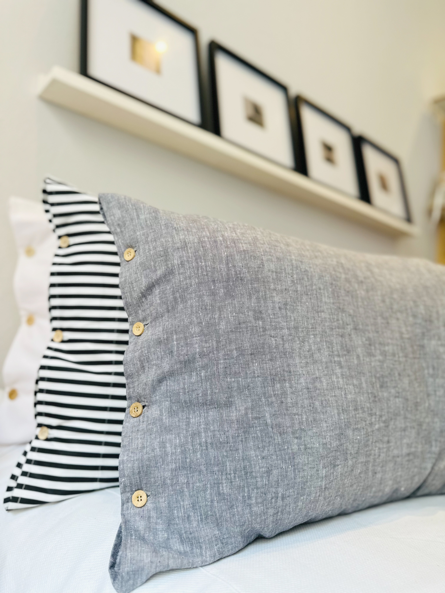 Os travesseirões de apoio Livia são o toque perfeito para seu conforto. Com medidas de 45 x 90cm, este conjunto inclui dois travesseiros, proporcionando o suporte ideal para noites de sono tranquilas e um descanso merecido. Suas capas, confeccionadas em mescla cinza, combinam elegância com aconchego, e são fechadas com botões de madeira, adicionando um toque natural e sofisticado à sua cama.