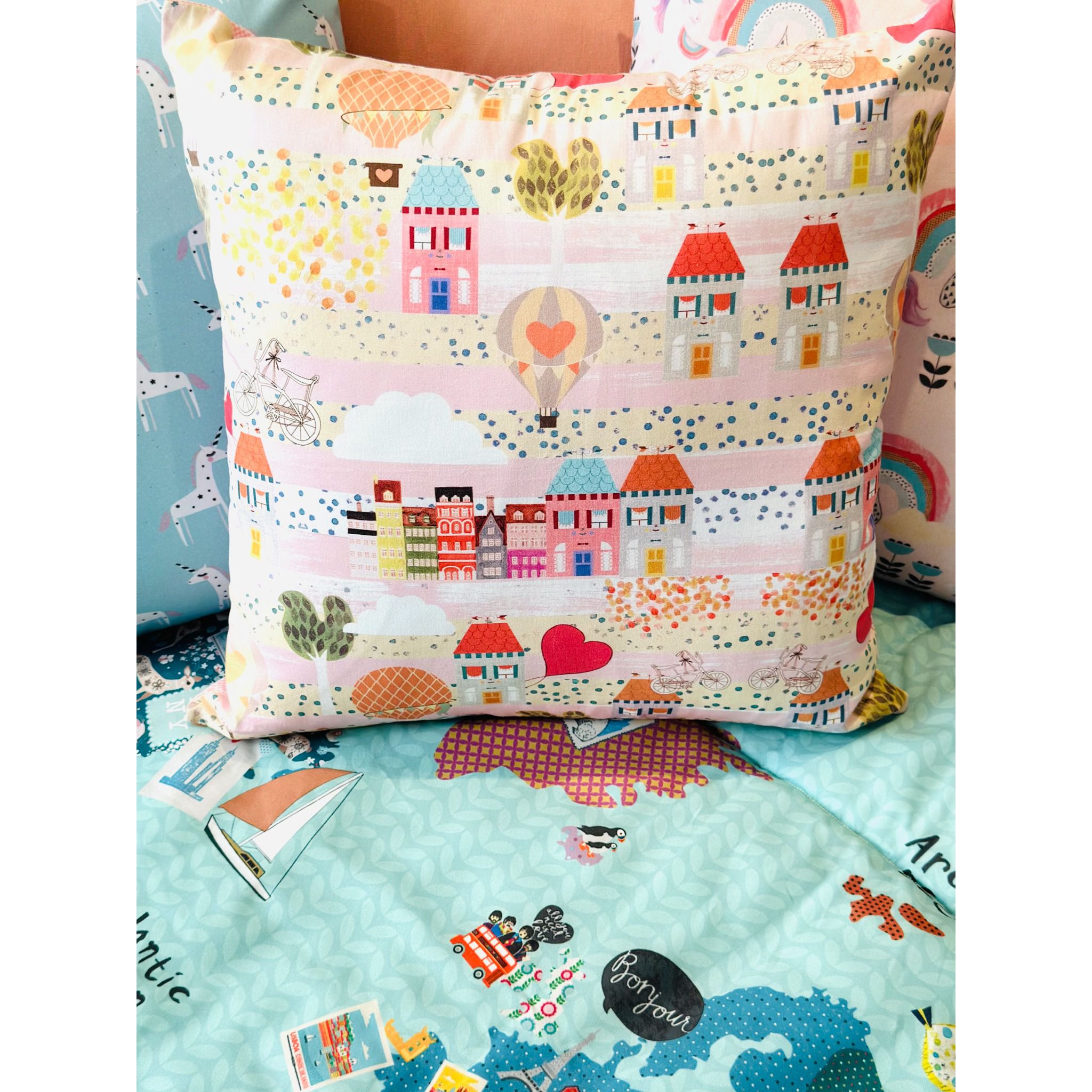 A Almofada Amsterdã, com uma estampa encantadora da Milk Studio, traz o charme das casinhas e bikes da cidade em seus detalhes. Com medidas de 43 x 43 cm, a estampa delicada em tons alegres sobre um fundo rosa bebê é a escolha perfeita para adicionar um toque especial e feminino ao quarto da sua pequena.