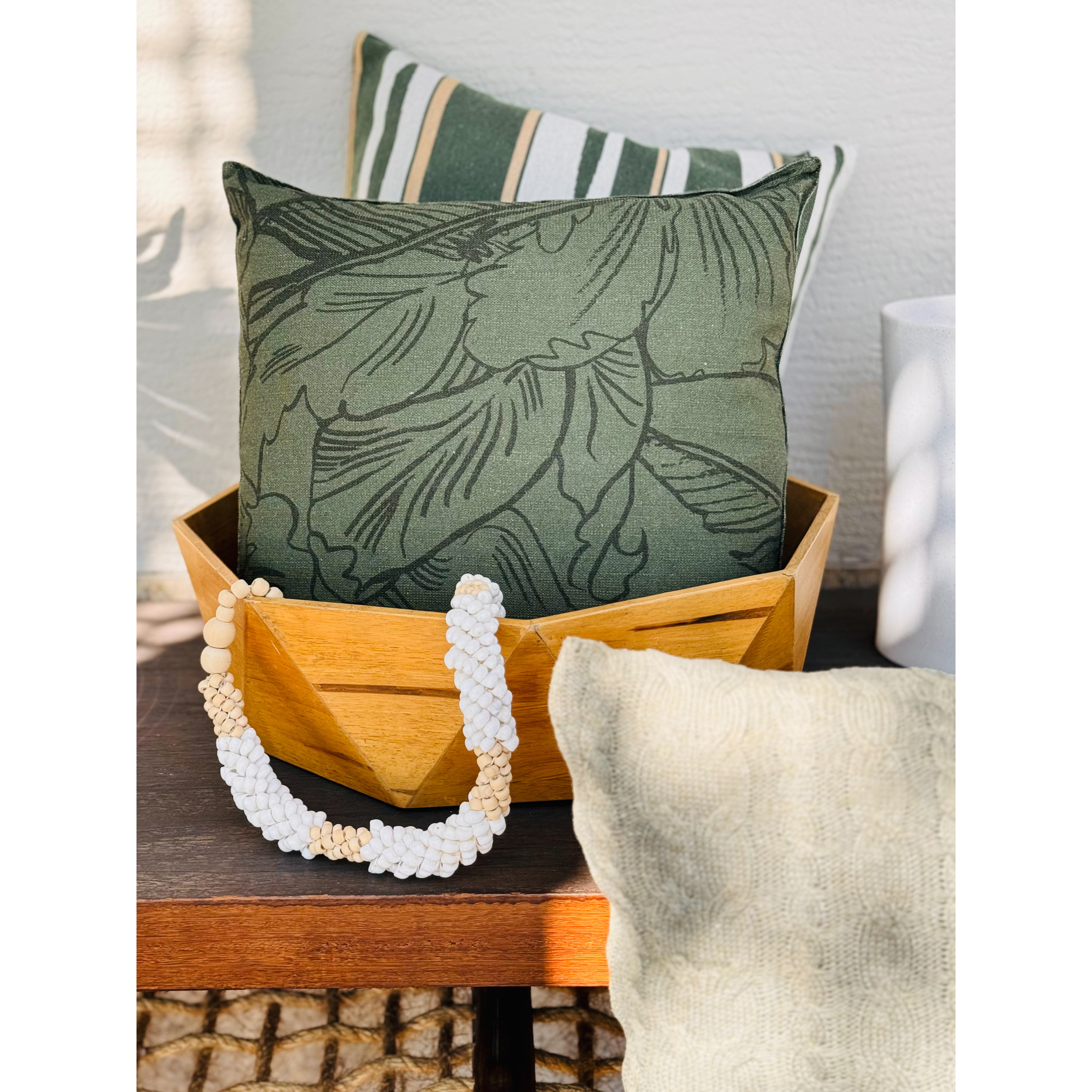 A almofada Bora Bora, com suas medidas de 50 x 50 cm, é uma peça confeccionada em tecido verde com um elegante padrão de folhas em tom mais escuro. Esta almofada traz um toque de natureza e tranquilidade, ideal para ambientes que buscam uma decoração serena e sofisticada. Transforme seu espaço com a beleza e o conforto da almofada Bora Bora e aproveite a sensação de estar em um paraíso tropical.