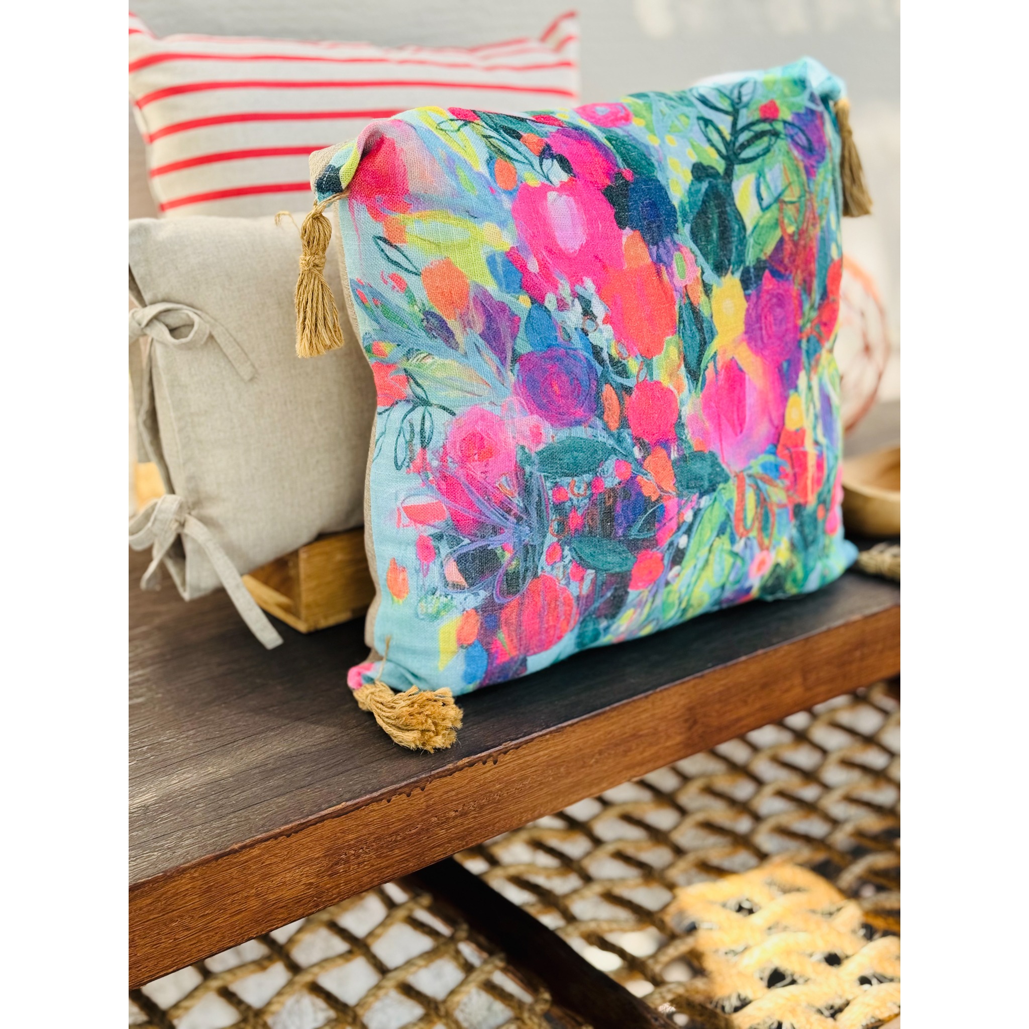 A almofada Cartagena, com suas medidas de 50 x 50 cm, é uma peça confeccionada em XXXX com uma vibrante estampa floral multicolorida em tons de rosa, azul, verde e amarelo. Suas laterais são adornadas com delicados tasséis em tom de creme, adicionando um toque de charme boêmio. Esta almofada combina cor e alegria, trazendo um toque de tropicalidade e vivacidade para qualquer ambiente. Transforme sua casa com a energia e o estilo de Cartagena e aproveite seu conforto e beleza.