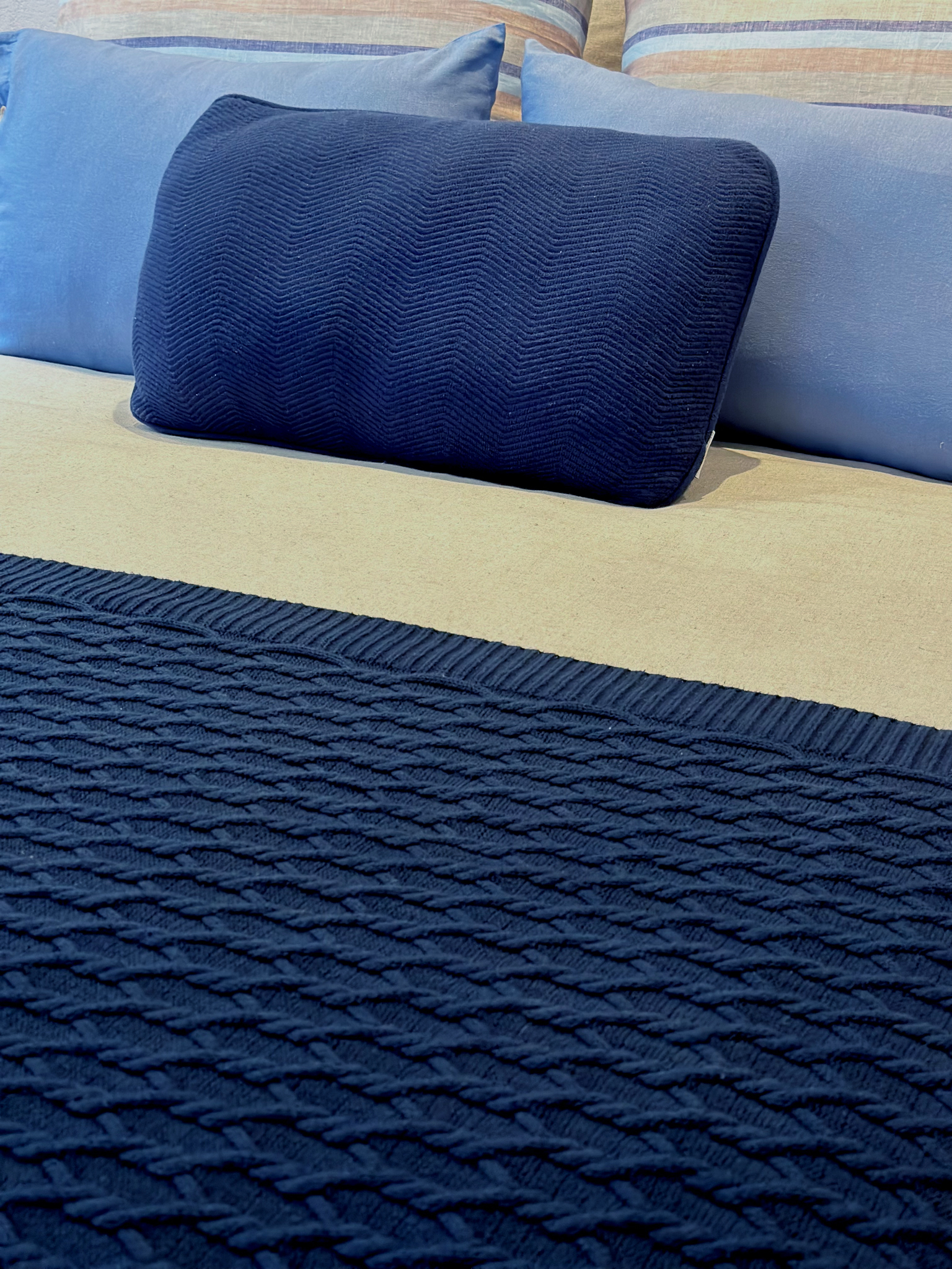 A Almofada Copacabana, cuidadosamente confeccionada em tricot marinho, é uma elegante adição ao seu espaço. Com medidas de 35 x 50 cm, seu charme singular é evidenciado pelo padrão zigzag, que nos faz lembrar das icônicas calçadas de Copacabana. A almofada oferece não apenas conforto, mas também um toque de estilo.