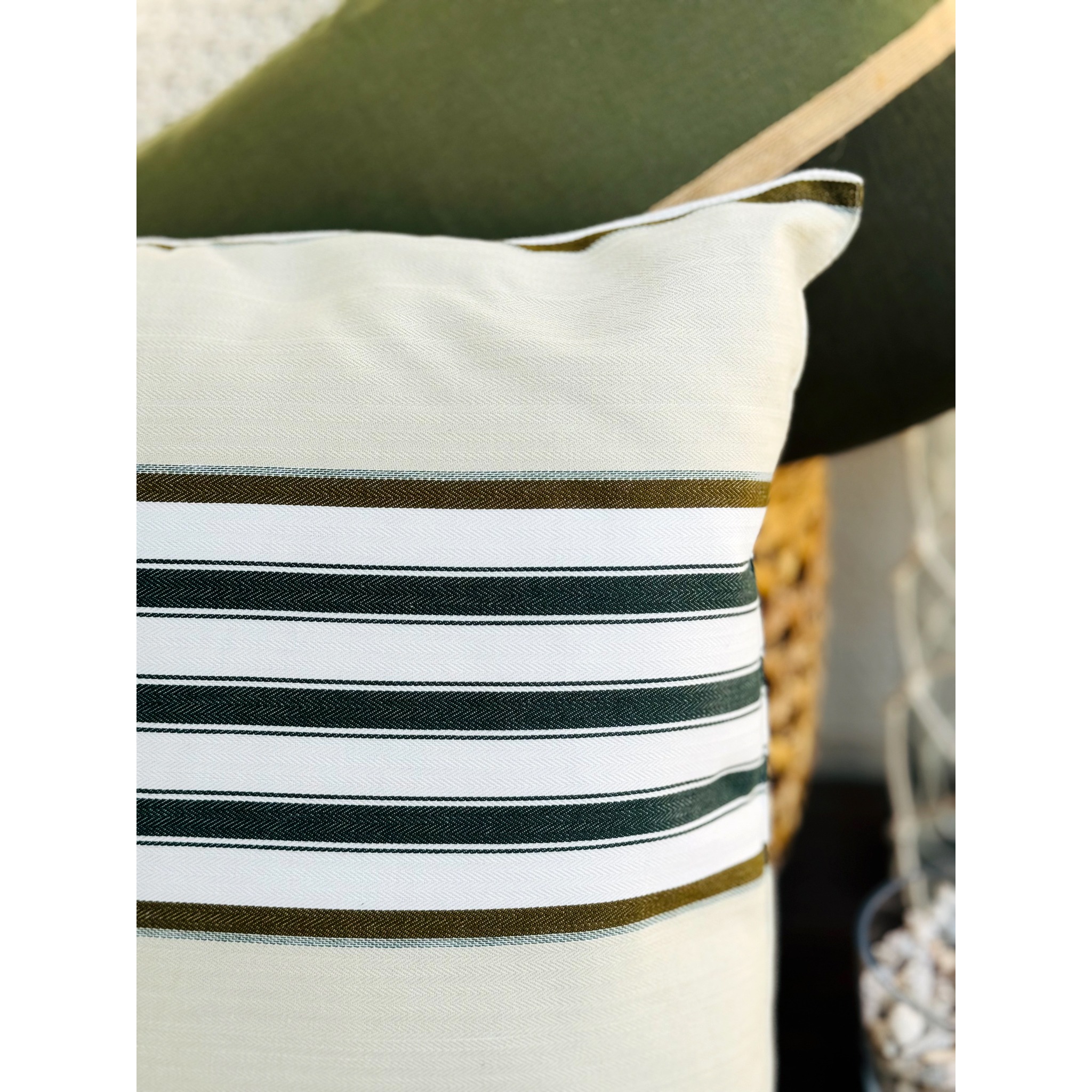 A almofada Jakarta, com suas medidas de 50 x 50 cm, é uma peça confeccionada em algodão num elegante tom de verde oliva. Possui listras nas cores verde, off-white e marrom que adicionam um toque vibrante e sofisticado à sua decoração. Esta almofada combina o charme asiático com um estilo moderno.