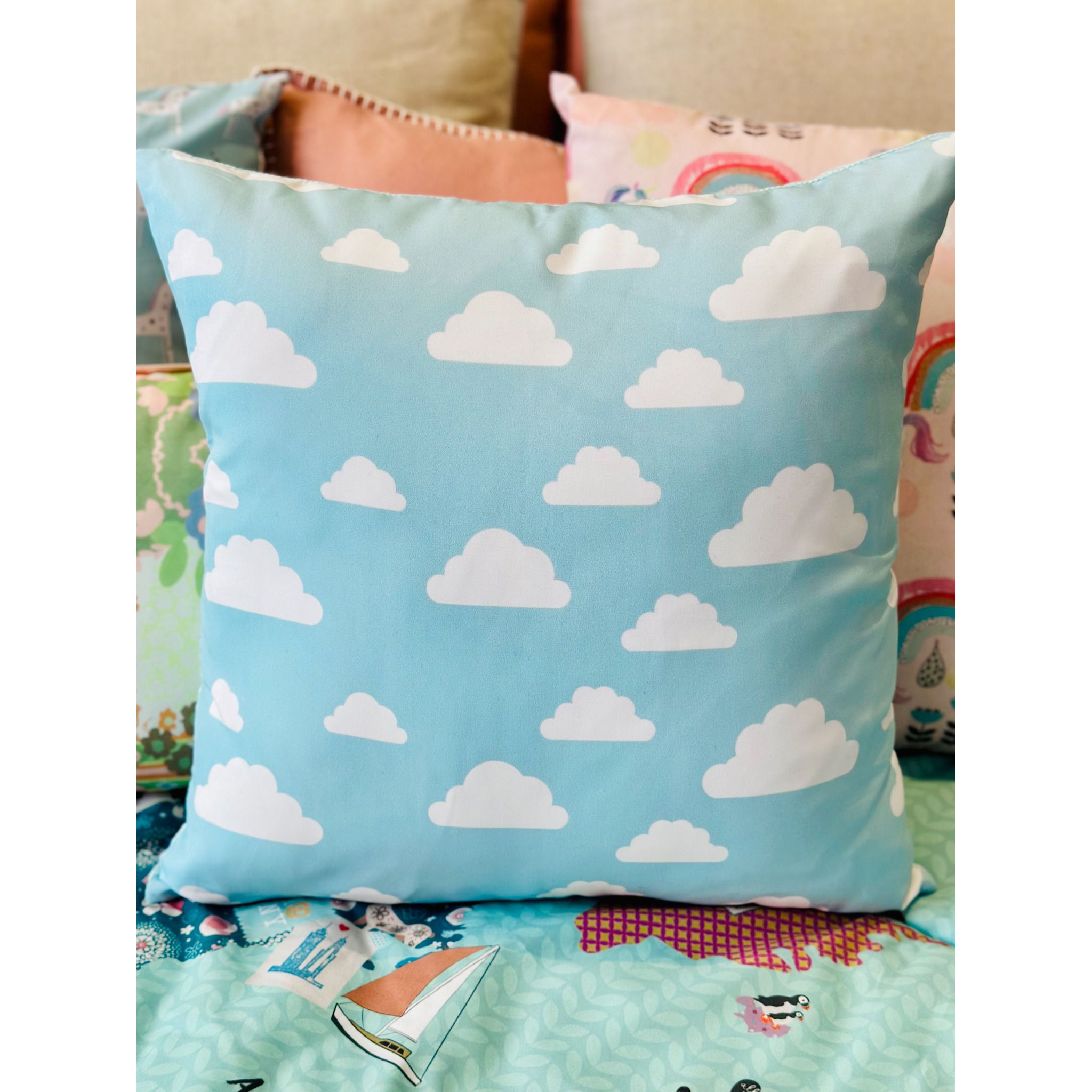 A Almofada Nuvens, de estampa da Milk Studio, traz a suavidade do céu para o quarto do seu pequeno. Com uma estampa encantadora de nuvens brancas em um fundo azul claro, esta almofada é um convite para sonhar acordado. Medindo 42 x 42 cm, ela adiciona não apenas conforto, mas também um toque de leveza pro cantinho dele.
