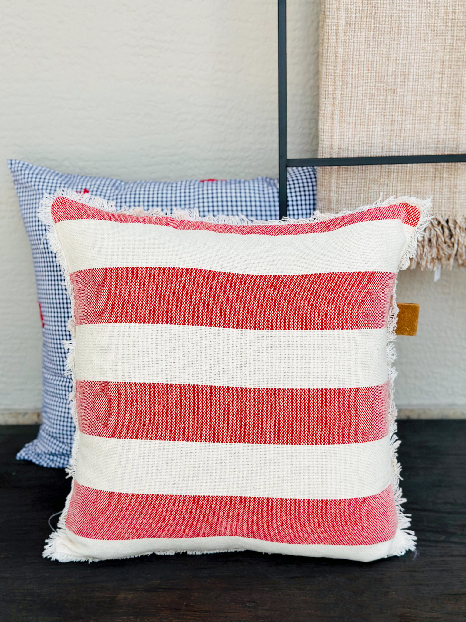 A almofada Salvador, com suas medidas de 45 x 45 cm e suas listras em tons cru e vermelho vivo, leva alegria pra qualquer espaço. O charme da peça fica por conta de suas bordas desfiadas. Esta almofada traz a alegria do povo baiano pra dentro de sua casa, deixando qualquer ambiente mais acolhedor, descolado e confortável.