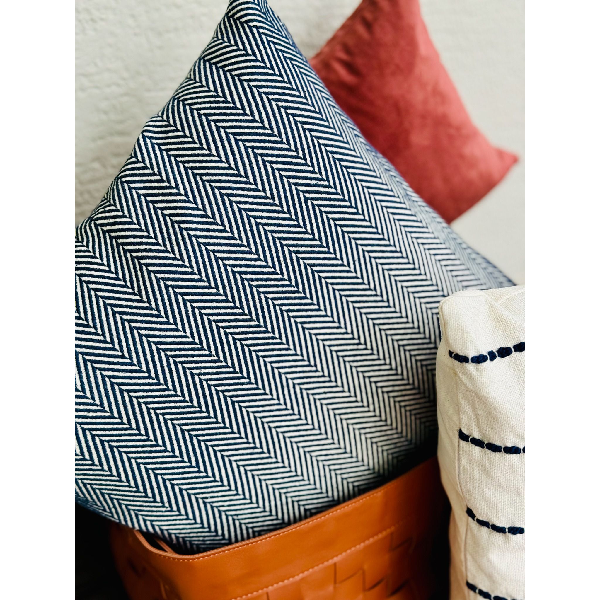 A Almofada Sintra de 50x50 cm, com seu elegante padrão em espinha de peixe, reflete o contraste entre o marinho e o branco. As linhas fluidas e as cores serenas fazem desta almofada um acessório de destaque, ideal para adicionar um toque de charme ao seu espaço.