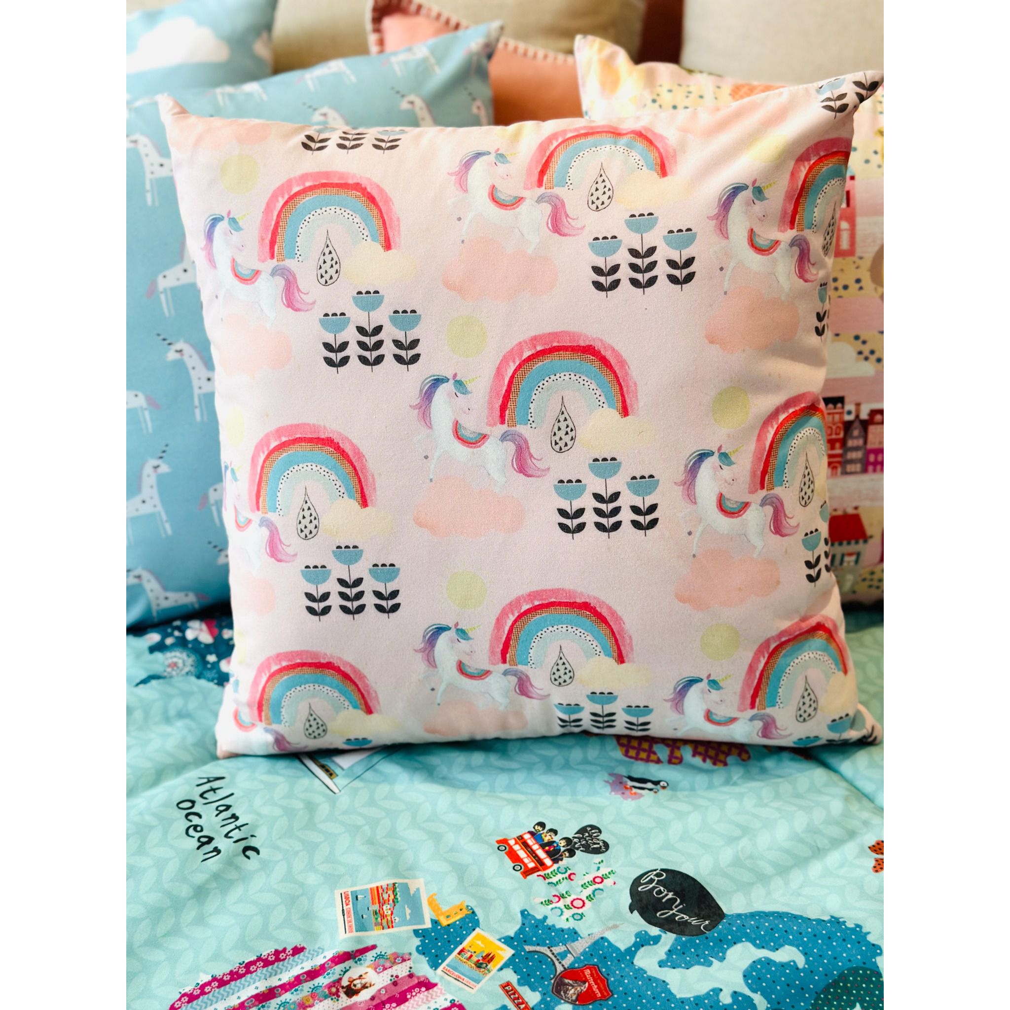 A Almofada Unicórnio Rosa, uma criação mágica da Milk Studio, é uma celebração da imaginação infantil. Com medidas de 45 x 45 cm, apresenta desenhos encantadores de unicórnios e arco-íris, todos delicadamente estampados em um fundo rosa claro.