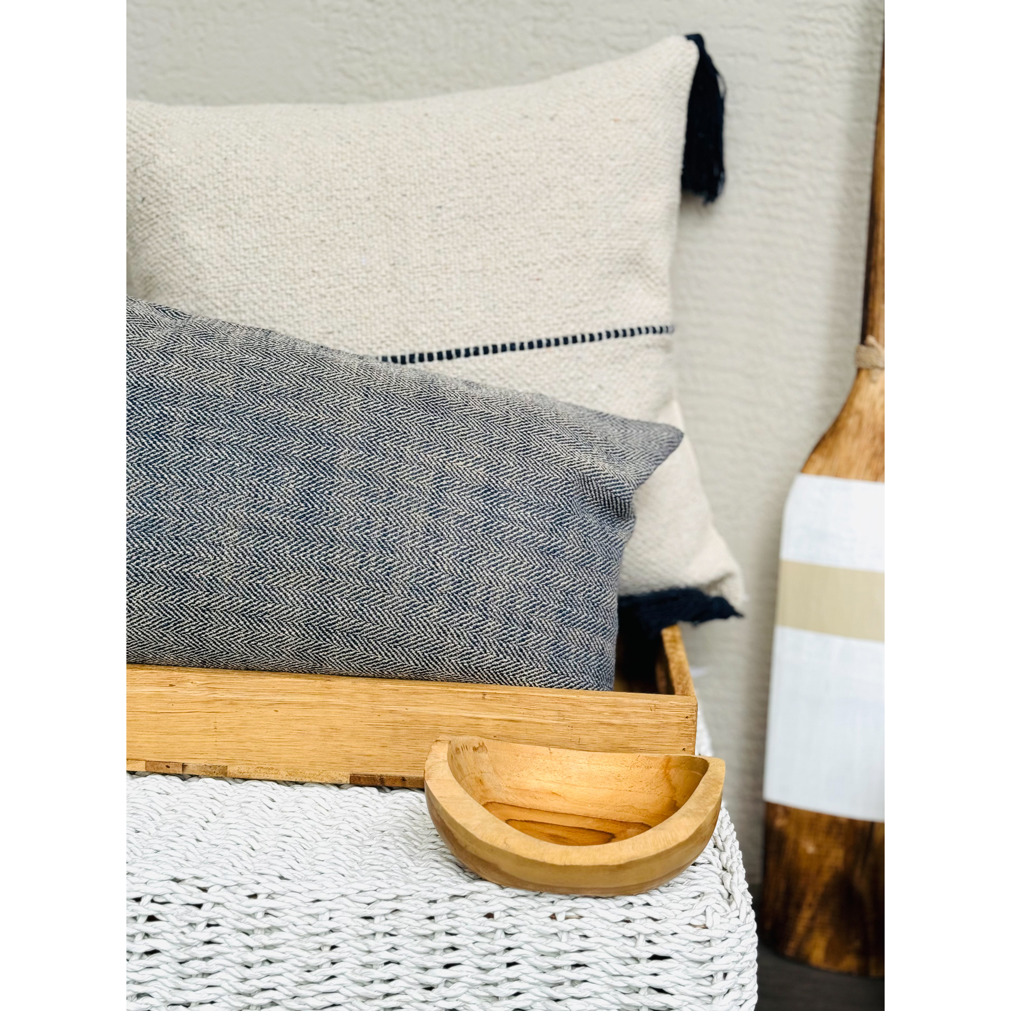A almofada Viseu de 35x50 cm exibe um padrão de espinha de peixe em tons de azul, bege e cinza, refletindo a elegância e o charme da histórica cidade portuguesa. O design texturizado oferece um toque contemporâneo e atraente, perfeito para enriquecer qualquer decoração com sofisticação.