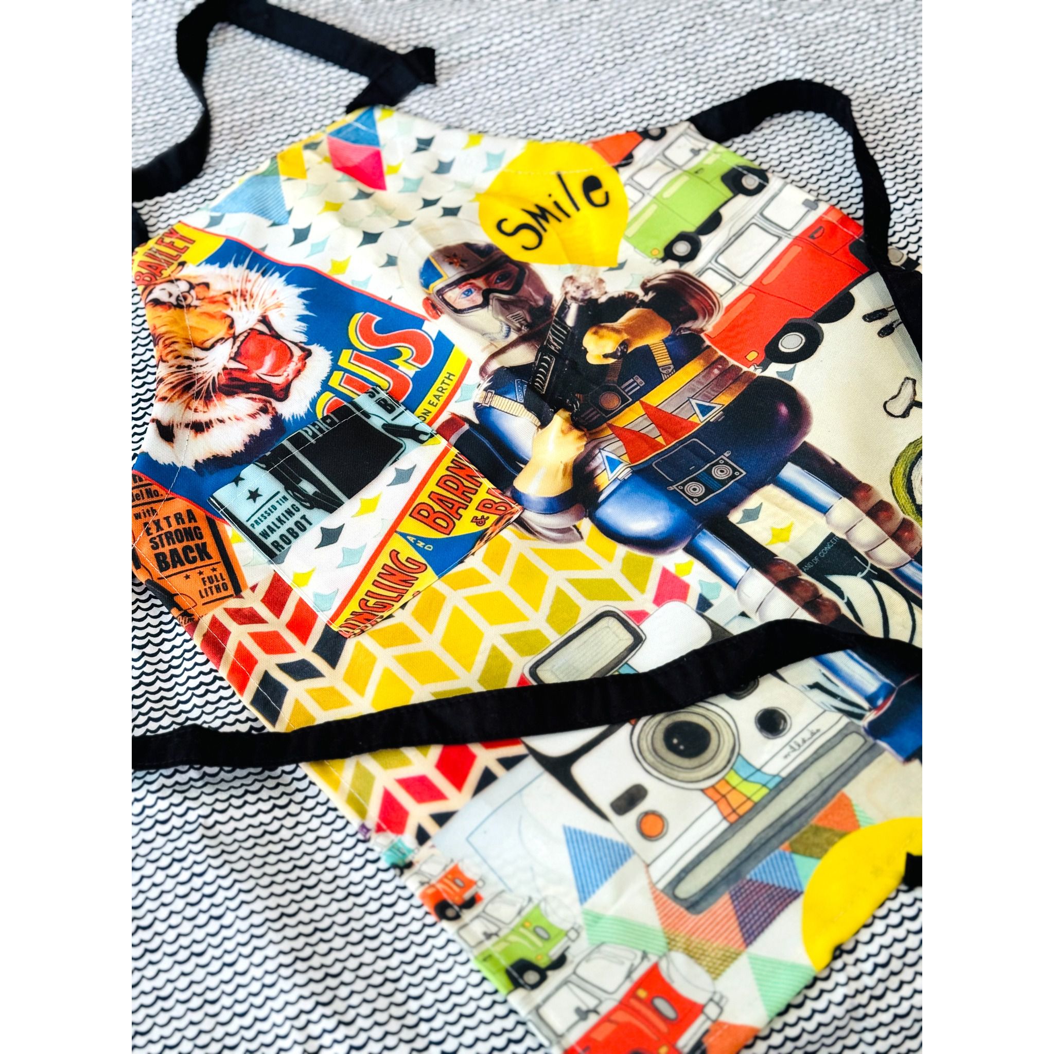 Este colorido avental infantil é uma verdadeira galeria de alegria e aventura, graças à estampa exclusiva elaborada pela Milk Studio. Com uma combinação vibrante de kombis, câmeras vintage e animais de circo, cada detalhe é pensado para encantar e inspirar. Medindo 50 cm de altura e 40 cm de largura, este avental é feito sob medida para os jovens artistas e pequenos ajudantes de cozinha. As tiras pretas ajustáveis, garantem conforto e praticidade. Não é apenas uma peça de vestuário funcional para manter as roupas limpas, mas um elemento de estímulo para a imaginação.
