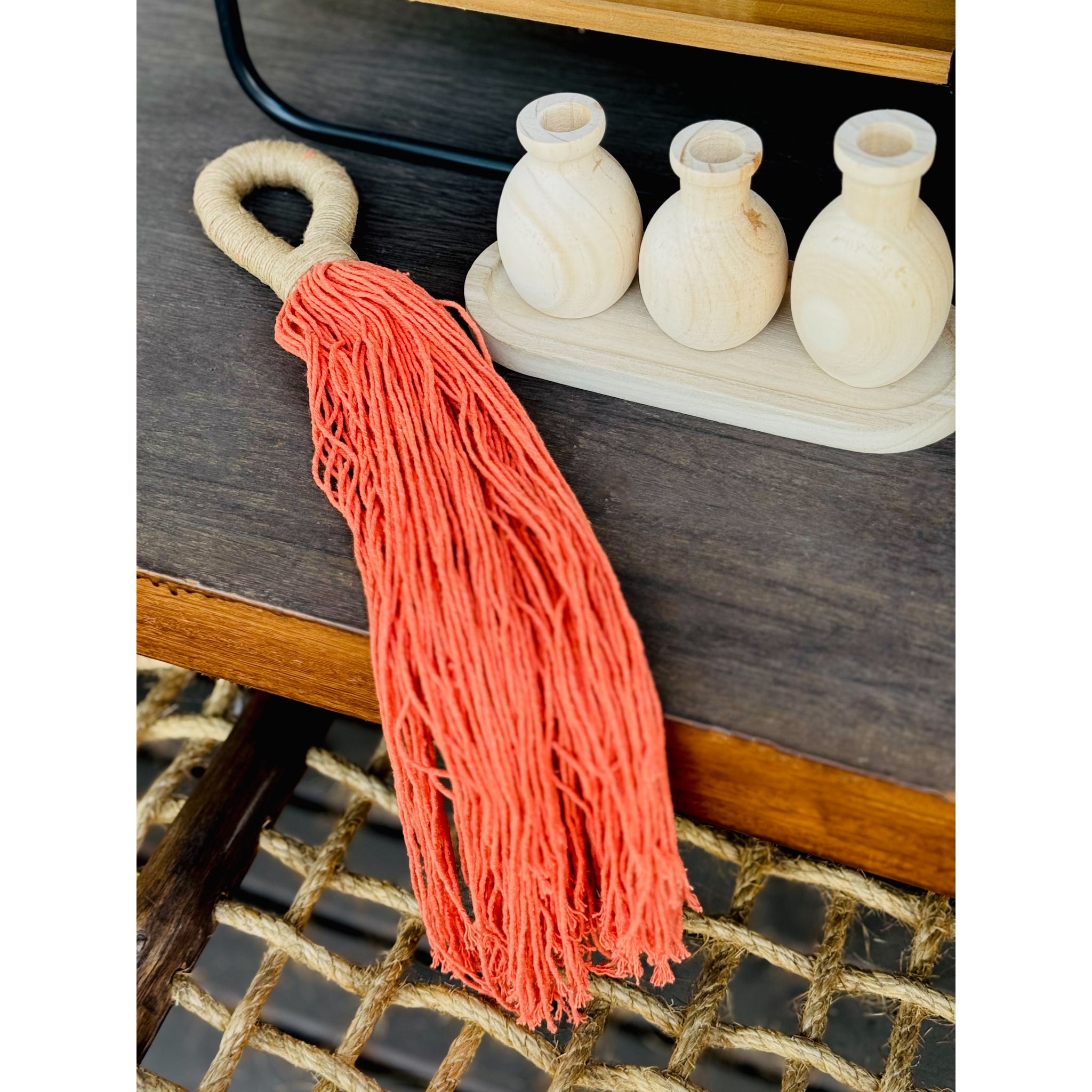 Este objeto de decoração é um pendente artesanal composto por franjas em tom coral vibrante, presos em uma base circular envolvida por corda de sisal natural. A combinação da cor coral com o material rústico cria um contraste interessante, trazendo tanto um toque de cor quanto uma sensação de aconchego ao ambiente. Esse item pode ser utilizado de diversas formas, como enfeite em portas, cortinas, ou até como um detalhe decorativo em móveis