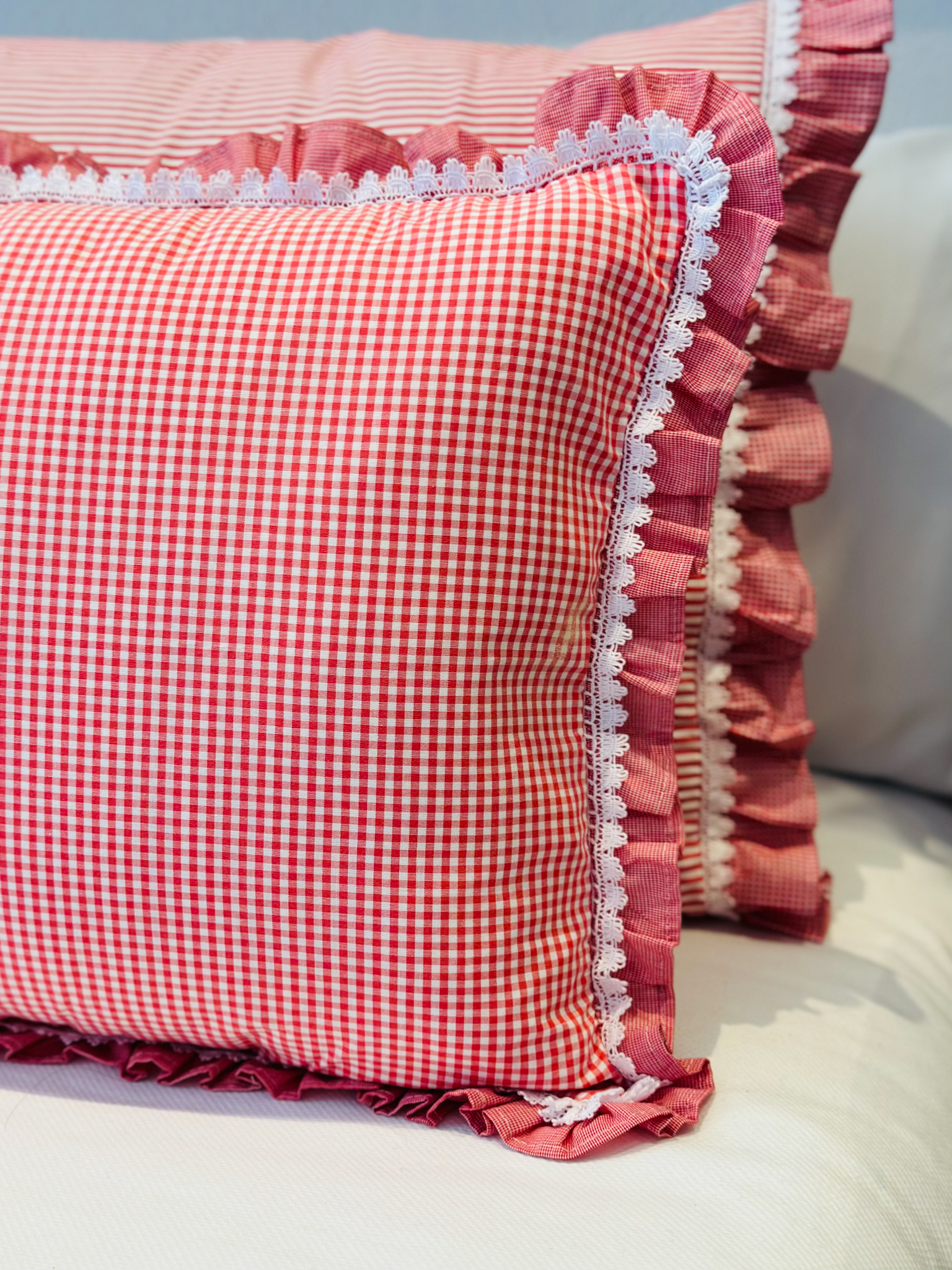 A almofada Valencia, com medidas de 40 x 60 cm, é confeccionada em algodão, apresentando uma adorável estampa Vichy em vermelho e branco, adicionando um toque de alegria ao seu quarto. Com um babado também em estampa Vichy em toda a sua volta e um delicado acabamento de bordado inglês, essa almofada combina estilo e charme de maneira impecável.