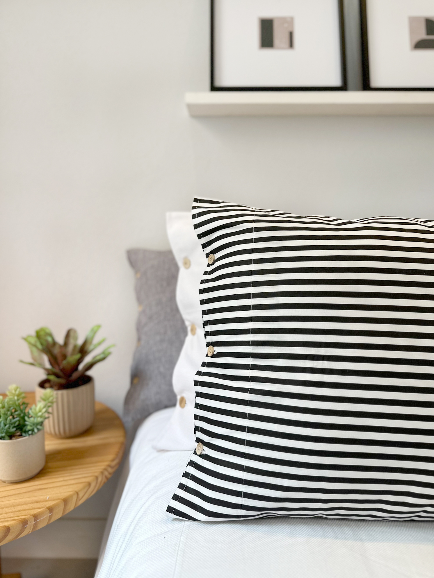As Fronhas Lili, confeccionadas em algodão listrado preto e branco de alta qualidade, oferecem uma combinação perfeita de estilo e aconchego. Com medidas de 50 x 70cm, este conjunto de duas fronhas acrescenta um toque elegante e atemporal ao seu espaço de descanso. O padrão listrado e os botões de madeira natural proporcionam uma estética charmosa e agradável.