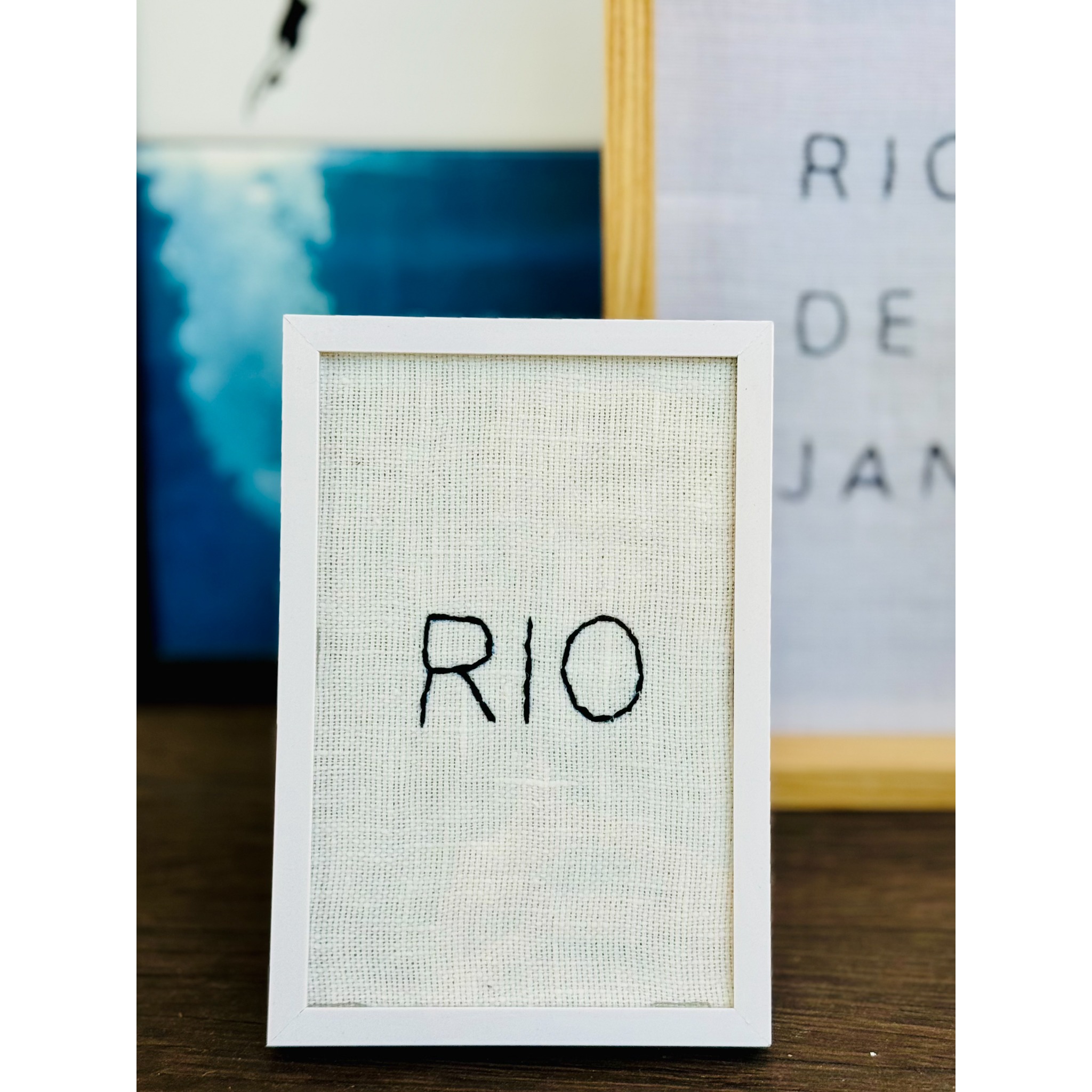 O quadro Rio, com suas medidas de 11 x 16 cm, é uma peça estilosa que traz a palavra "RIO" bordada em um elegante tecido de linho branco. Emoldurado em uma moldura branca minimalista, este quadro traz um toque moderno para sua decoração.