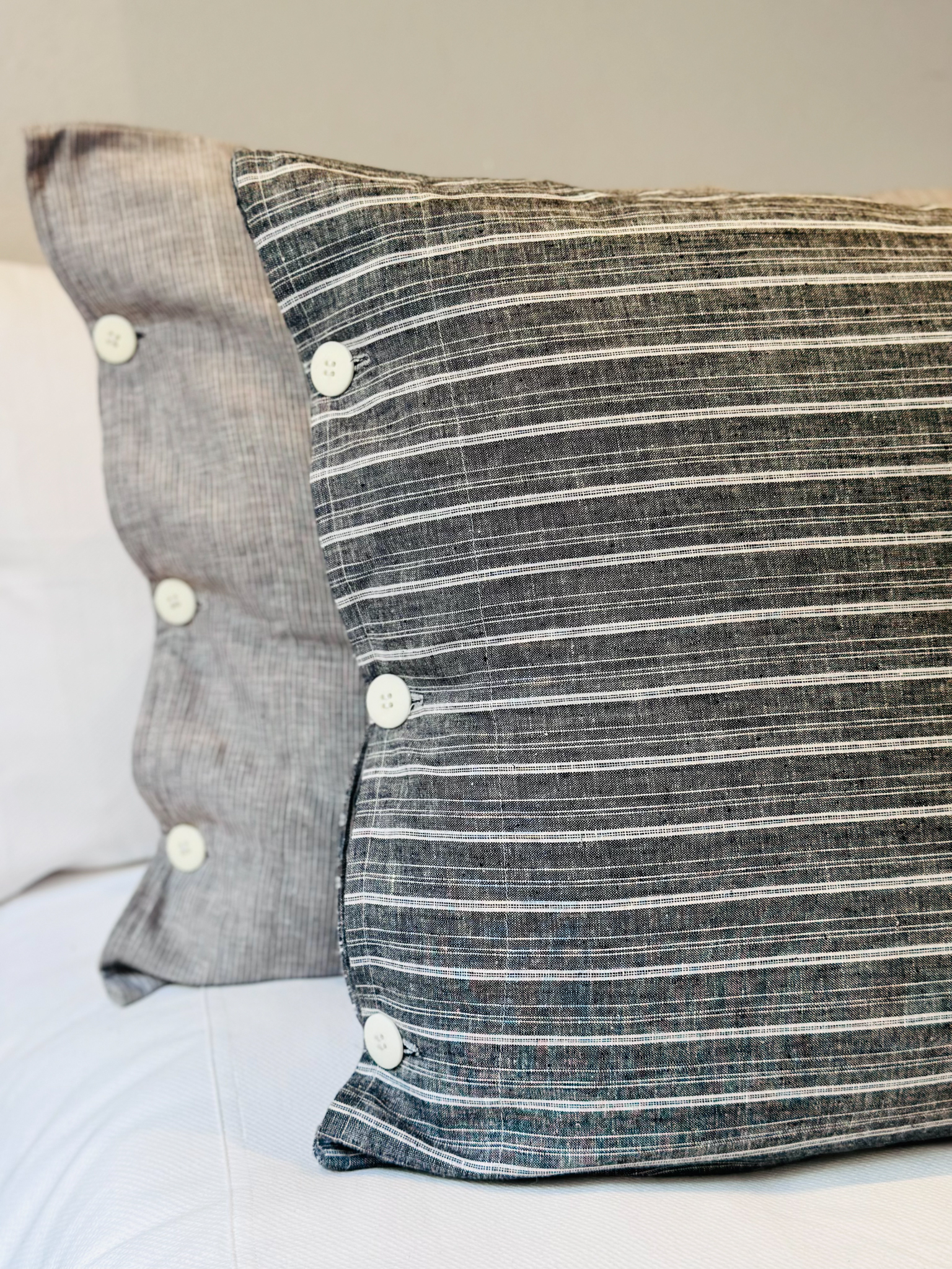 As fronhas Silvia, com medidas de 50 x 70cm, combinam o charme do linho listrado preto e branco com a praticidade do fechamento lateral por três botões. Esse conjunto de duas fronhas é a escolha ideal para quem busca uma atmosfera sofisticada no quarto e noites tranquilas de sono.